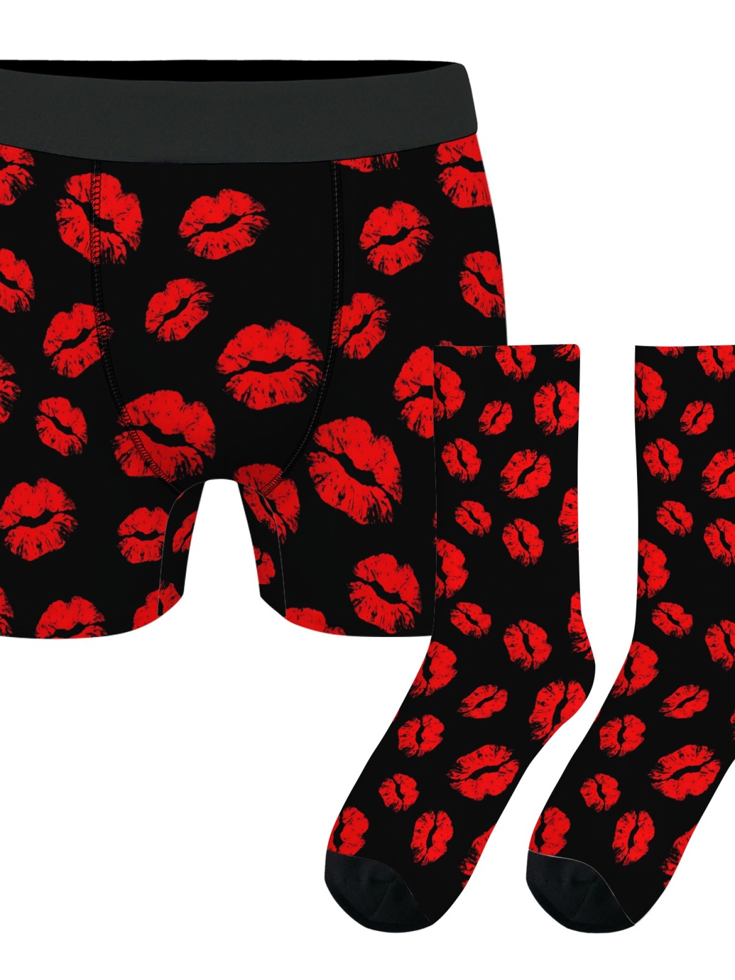 Show him how much he's loved with this "Covered in Kisses" Underwear & Socks Bundle. This passionate set features a bold, all-over pattern of red lipstick marks on a sleek black background, making it the perfect mix of sexy and sweet.