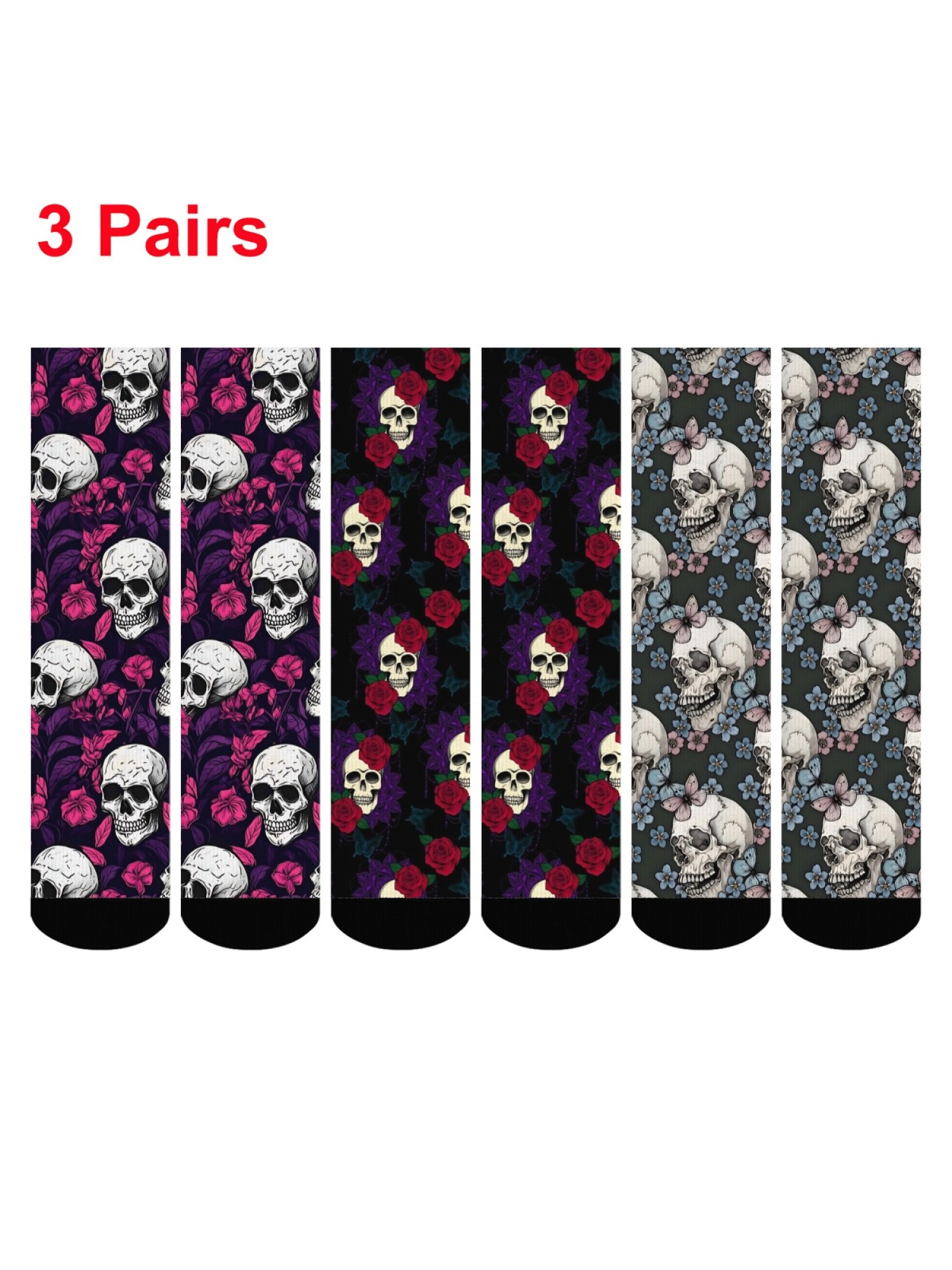 "Floral Skull" Gothic Art Crew Socks | Rose & Butterfly Skeleton Print Set (3 Pairs)