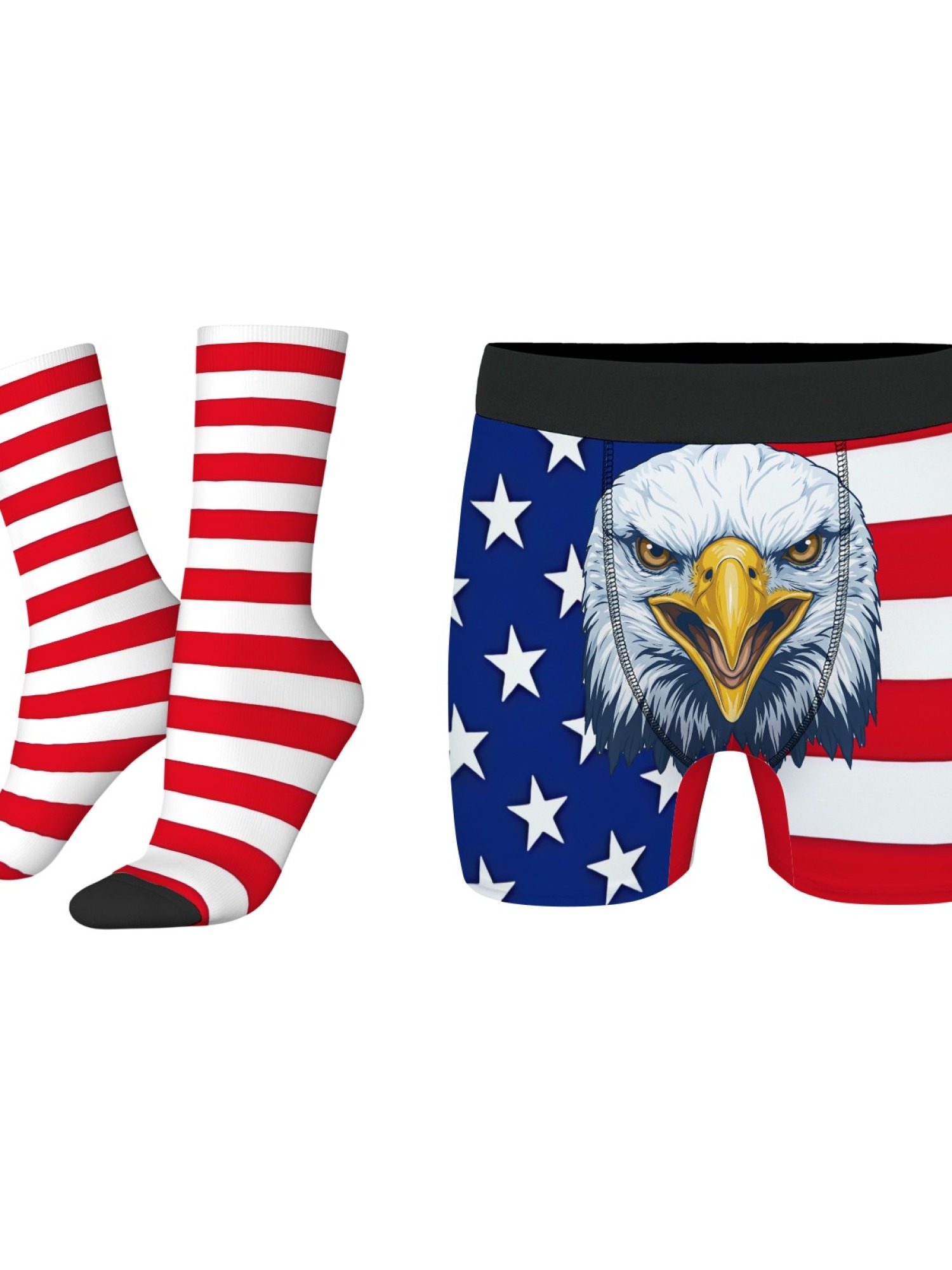 Show off your American pride where it counts with this USA Flag Underwear & Socks Bundle. This bold set features the stars and stripes wrapping around your legs, with a fierce Bald Eagle graphic front and center on the pouch to protect your "freedom."