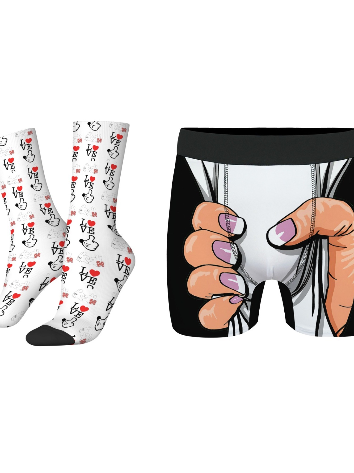 • 2-Piece Bundle: Includes 1x "Grabbing Hand" Trunks + 1x Pair of "Love" Pattern Socks.