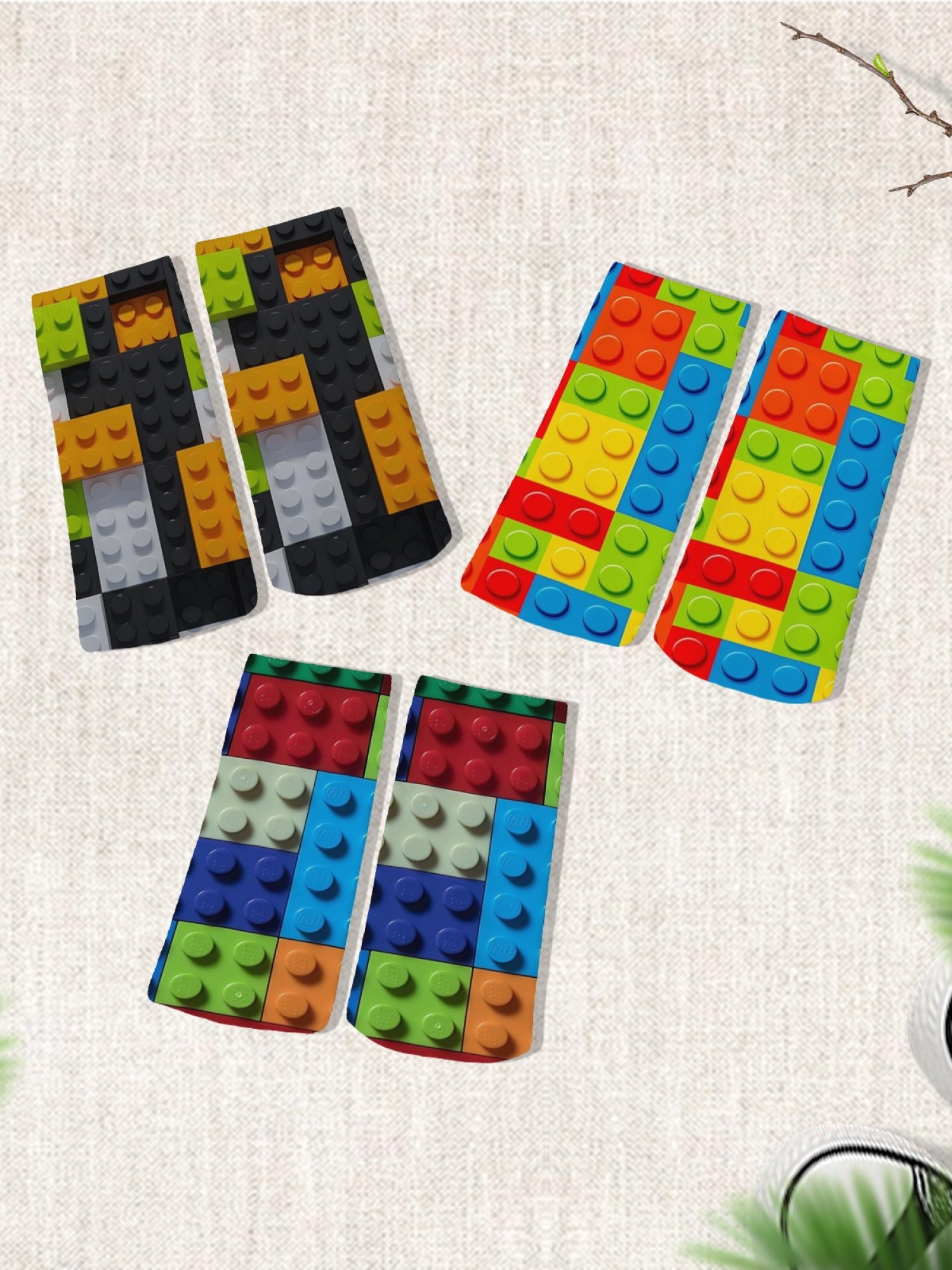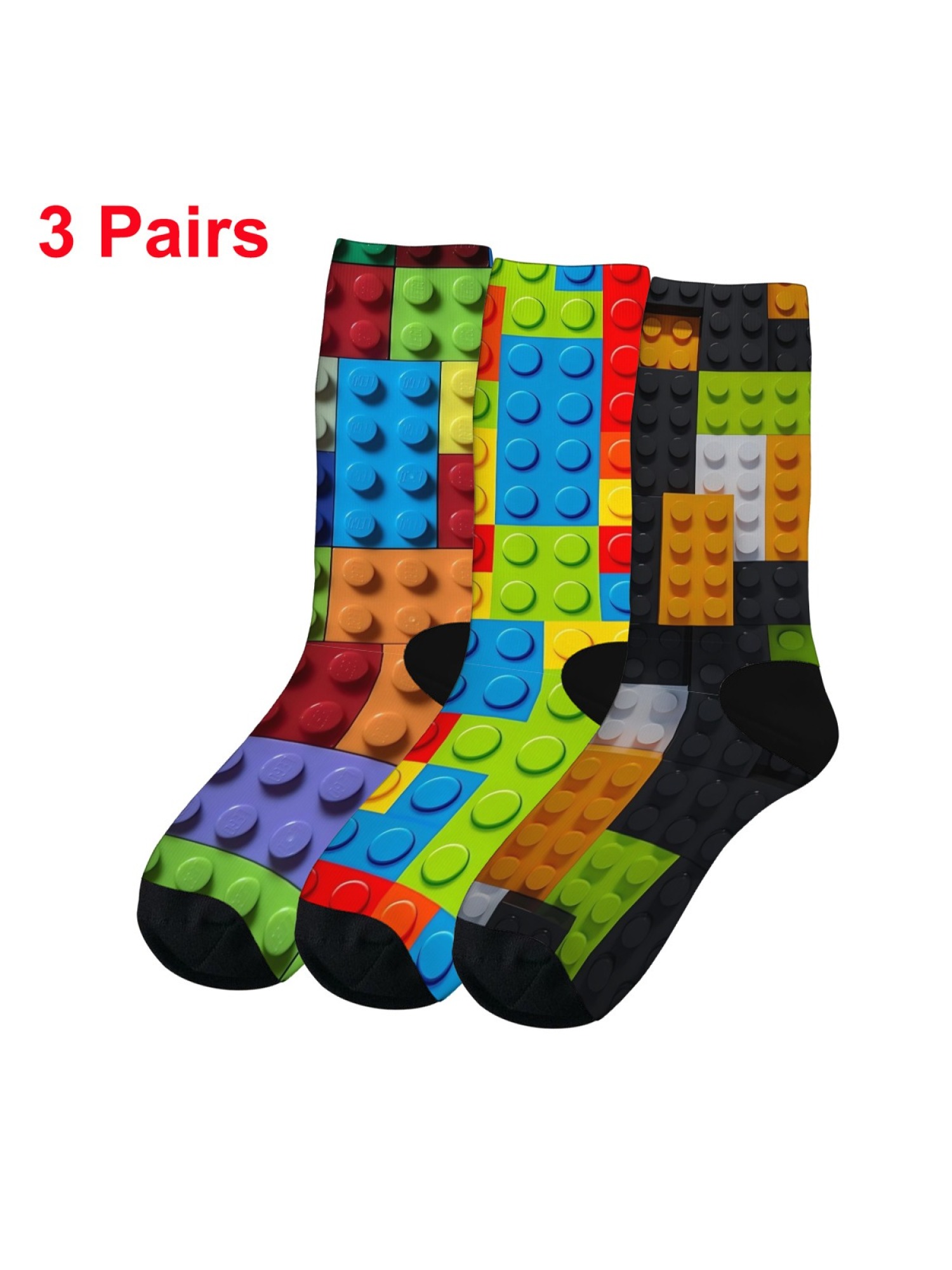 "Master Builder" Colorful Building Block Socks | 3D Toy Brick Graphic Crew Sock Set (3 Pairs)