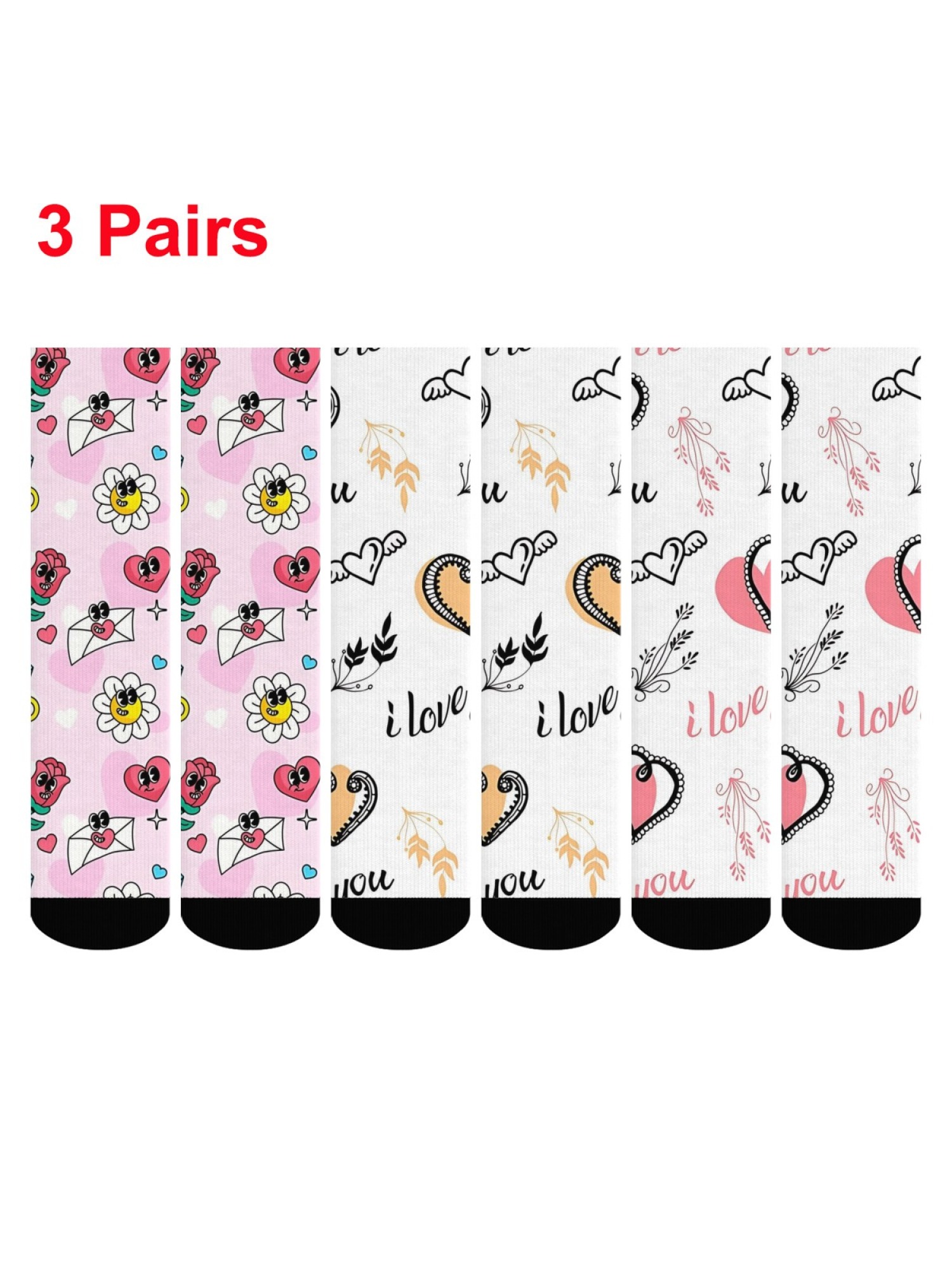 "Doodle Love" Romantic Crew Socks | Cute Heart & Cartoon Flower Print Set (3 Pairs)