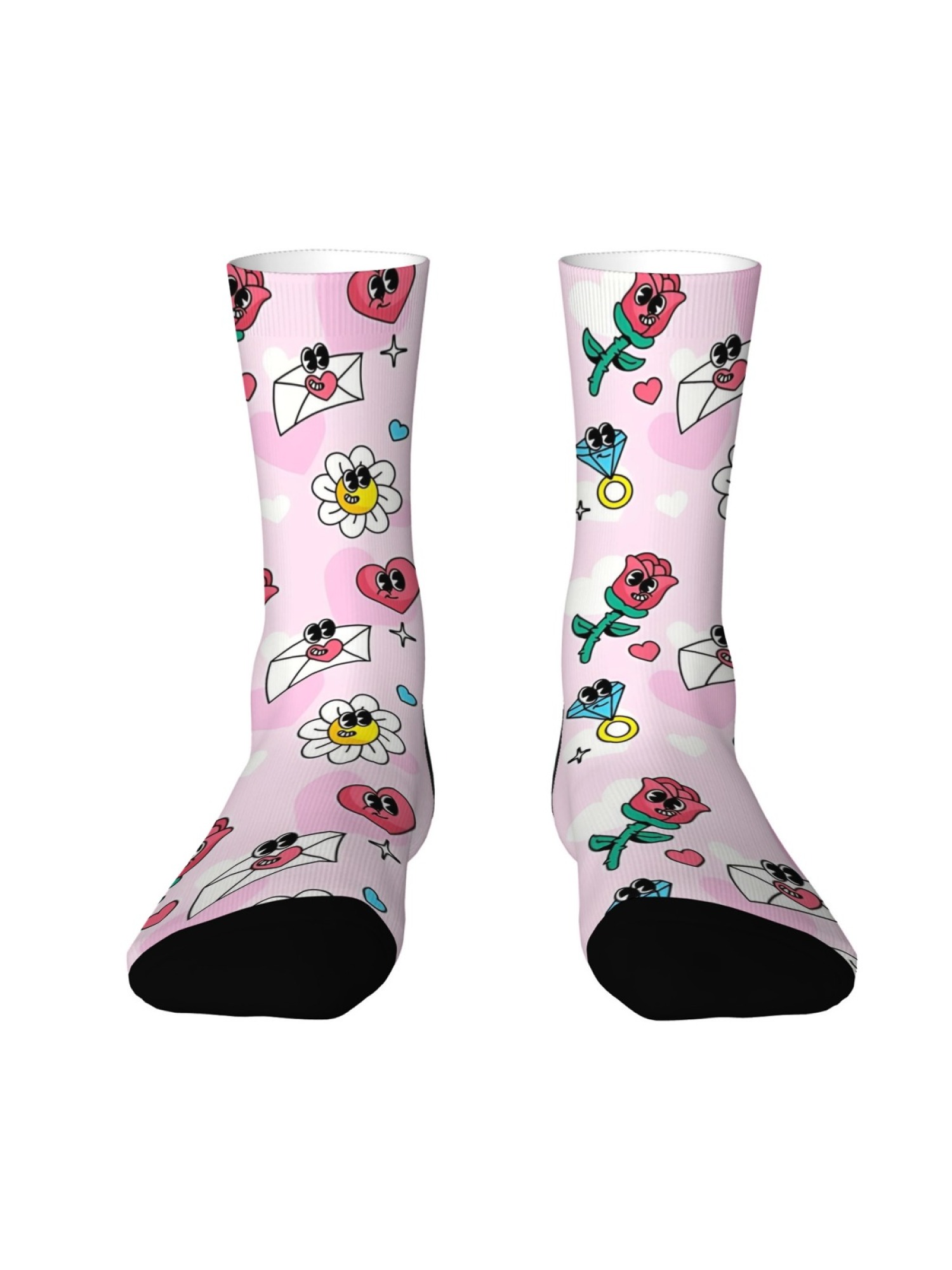 • 1x Retro Pink Pair: Featuring a fun, Y2K-inspired print of cartoon hearts with faces, smiling daisies, and love letters on a bubblegum pink background.