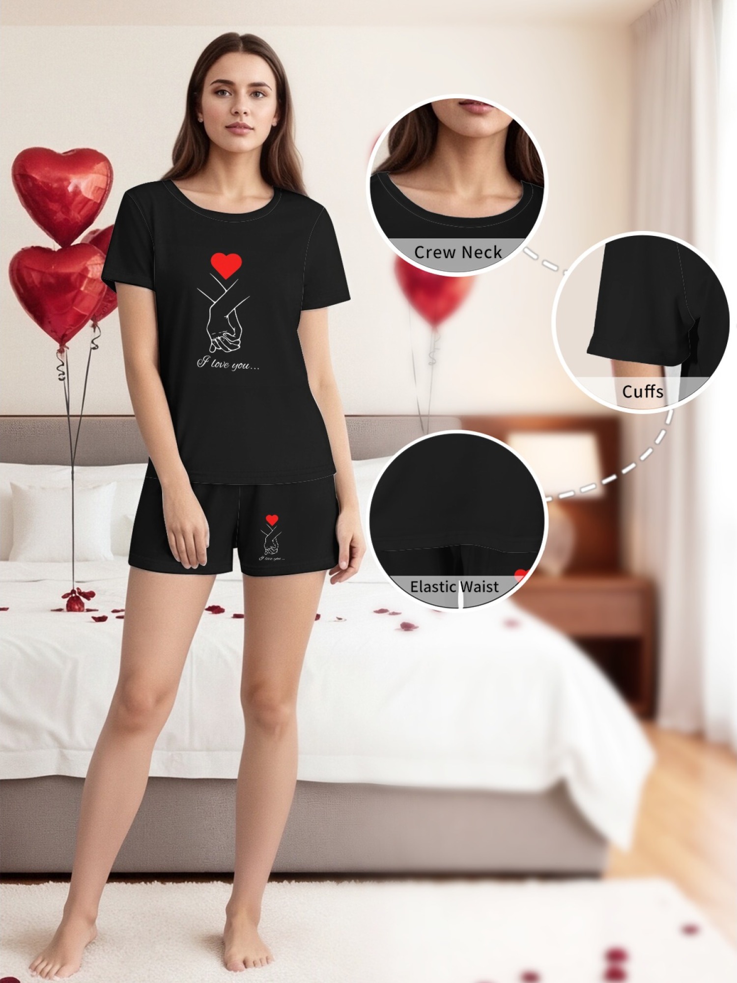 • The "LO-VE" Connection (Black or White): A playful split design where the boy holds the "LO" balloon and the girl holds the "VE". When you stand together, the picture is complete! Comes with fun patterned shorts (Lips or Hand-Hearts).