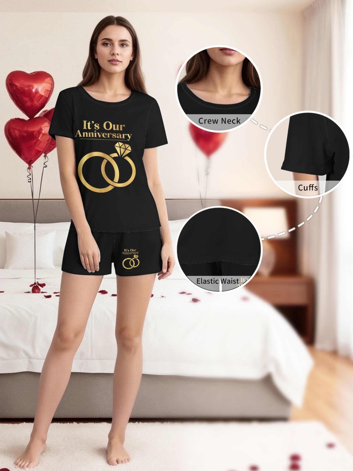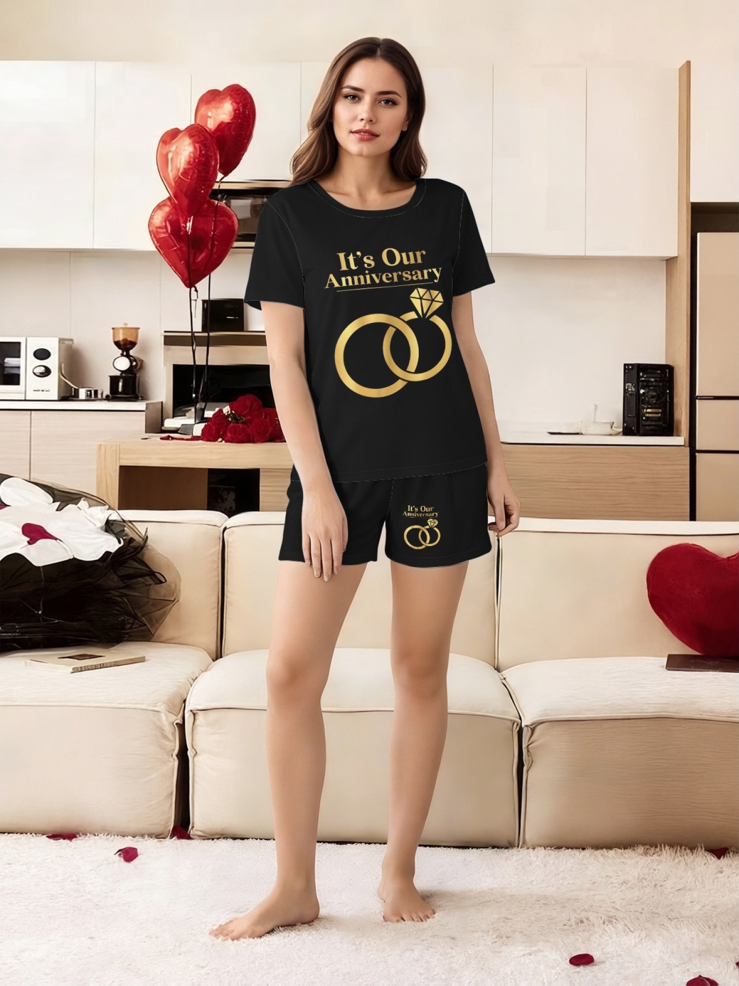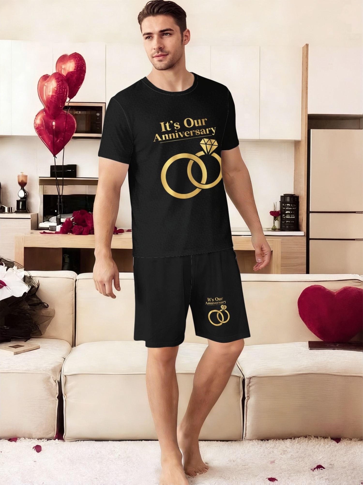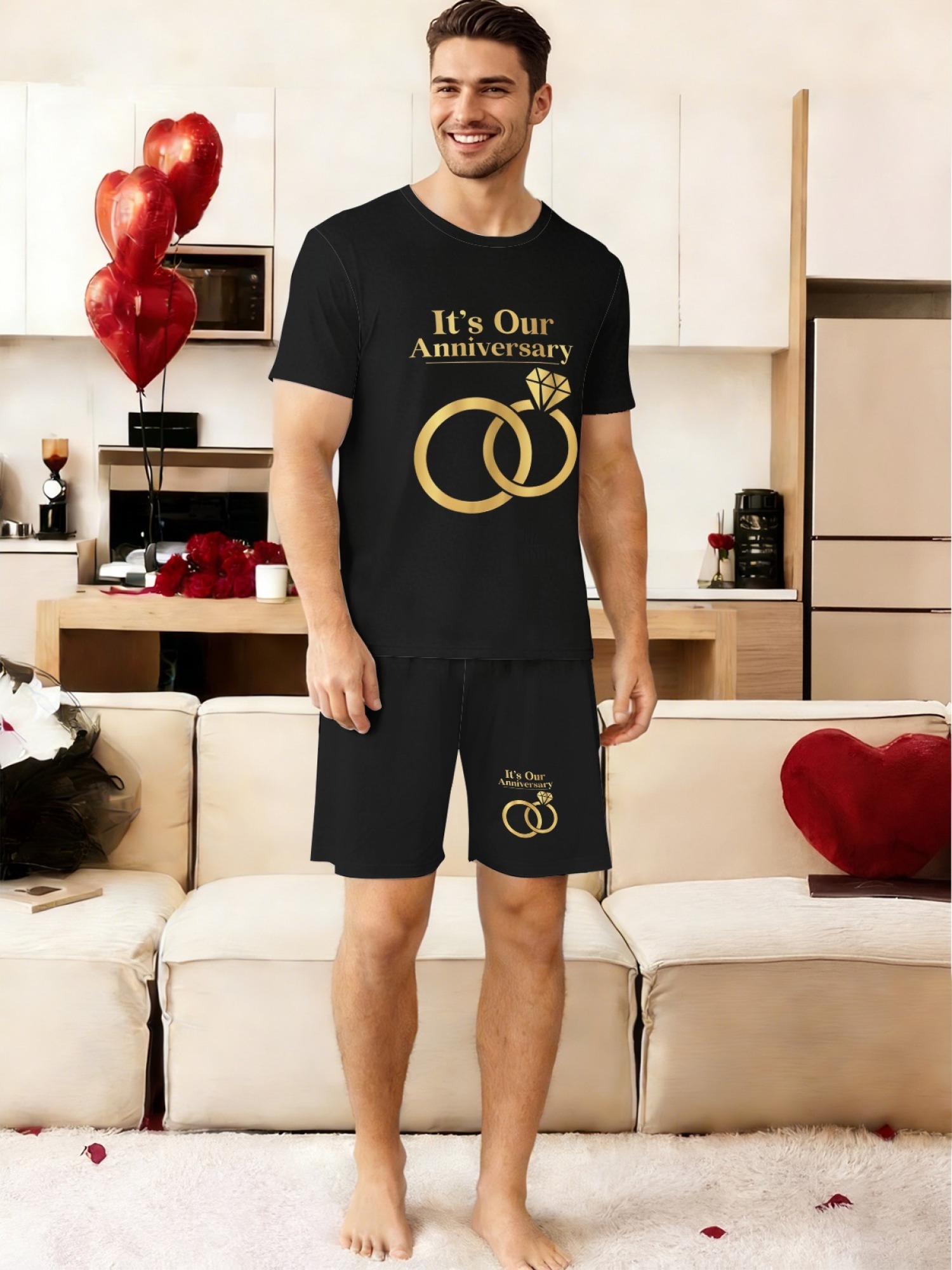 "It's Our Anniversary" Matching Couple Set – Black T-Shirt & Shorts Outfit with Gold Ring Print