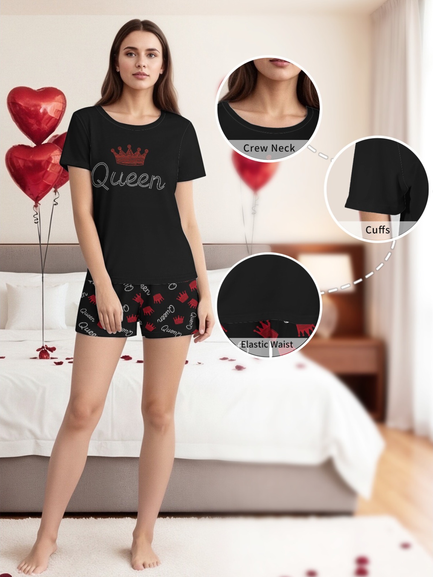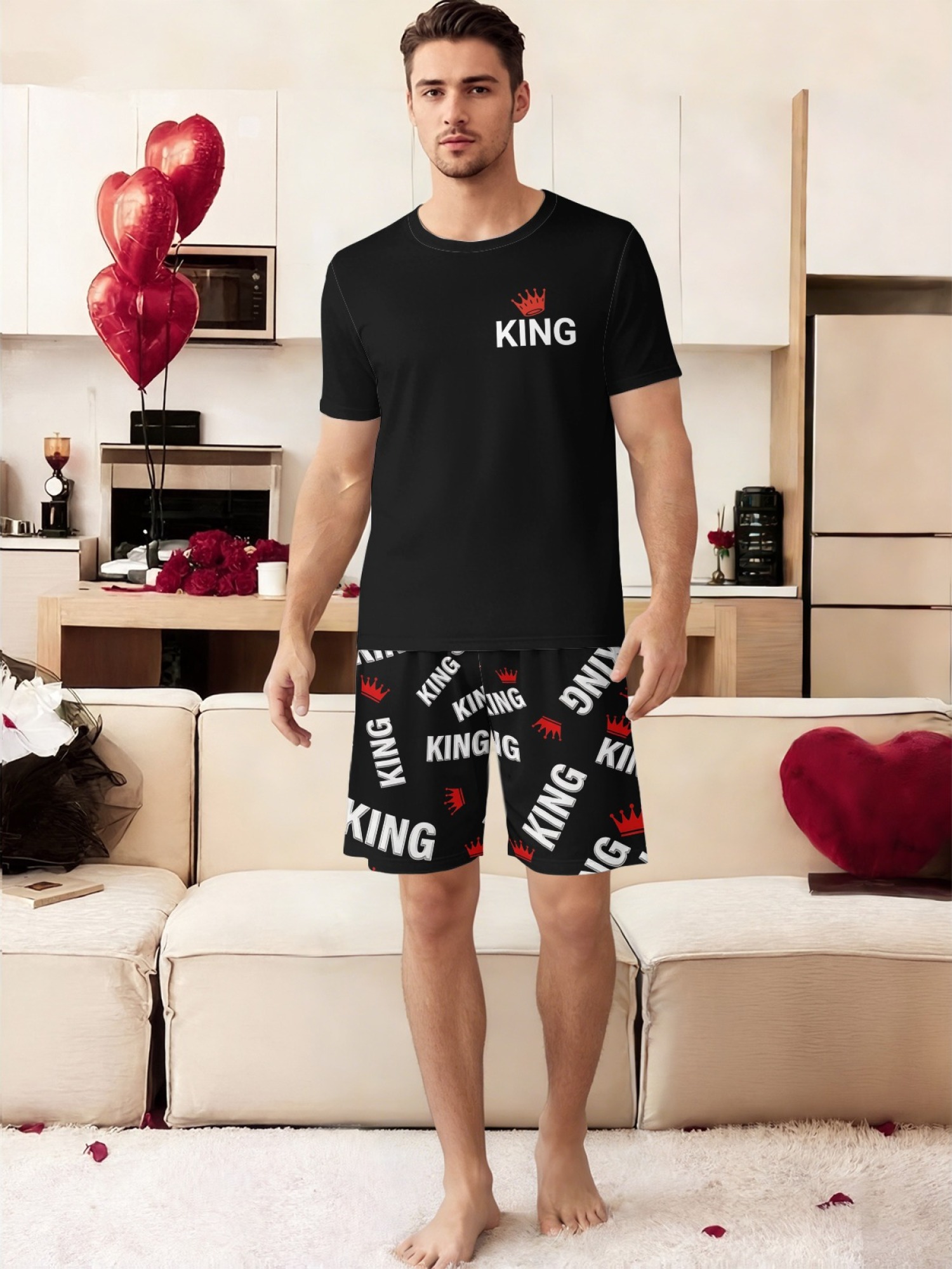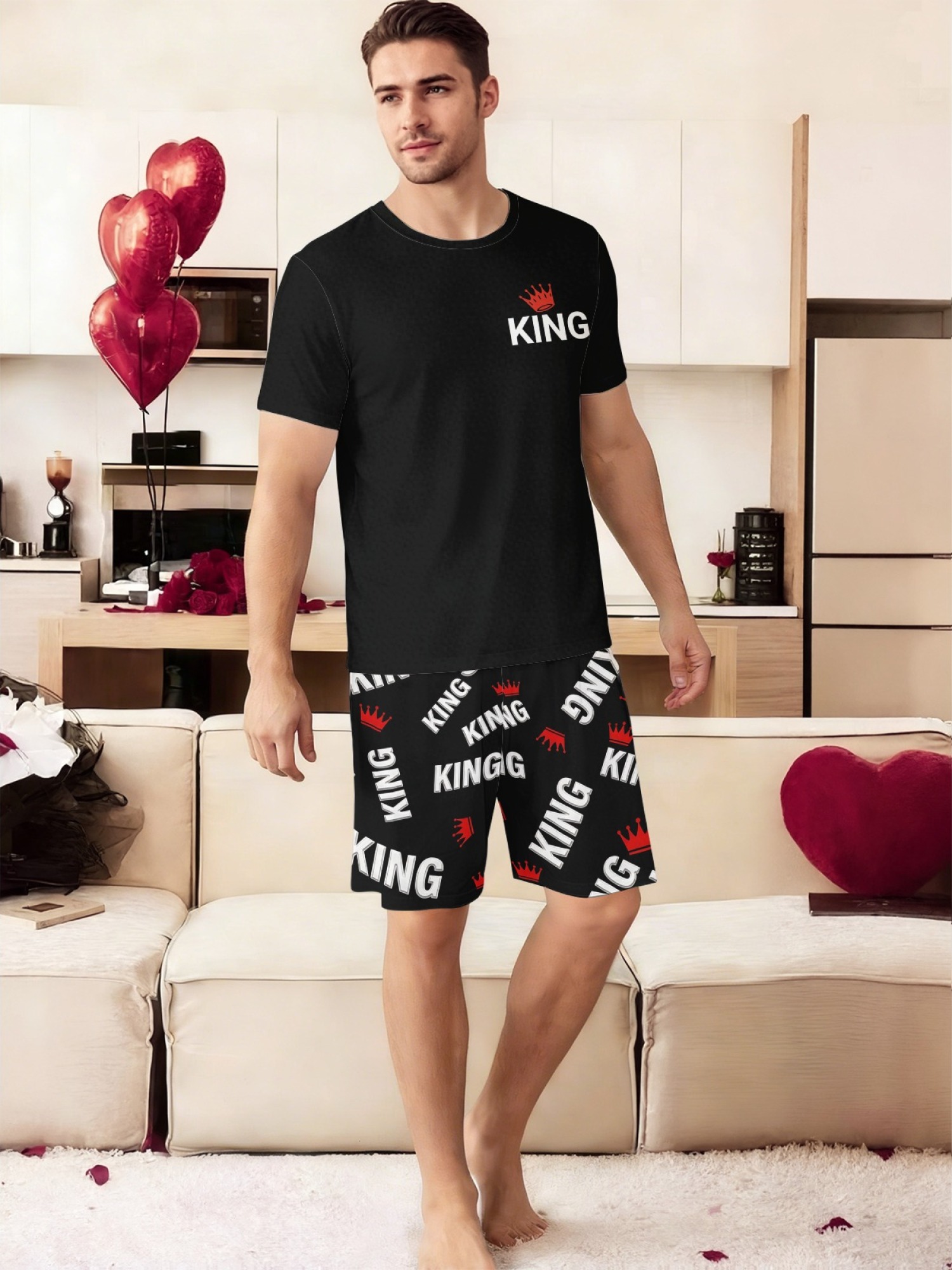 The men's set features a sleek T-shirt with a chest logo and shorts covered in a bold "KING" print. The women's set features a glamorous "Queen" script graphic (printed to look like sparkling studs) on the tee, paired with matching crown-patterned shorts. Whether you're on a honeymoon, vacation, or just lounging at your castle, this set is a must-have.