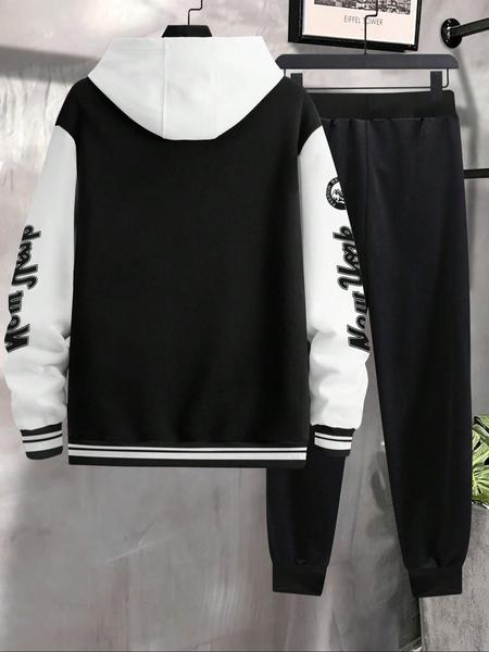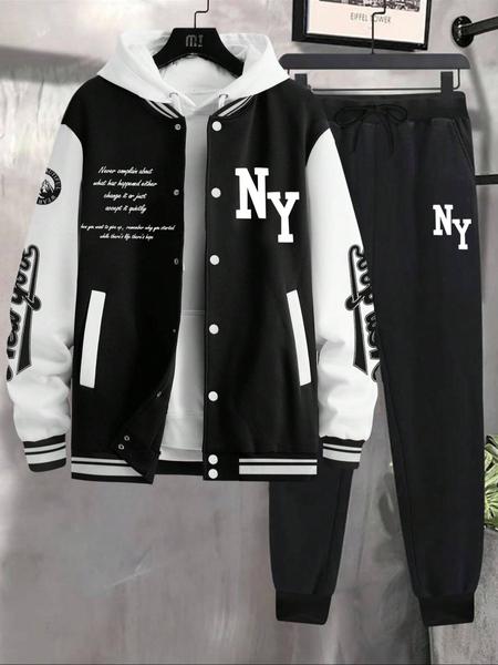 Men's Letter Print Slogan Baseball Jacket & Pants Two-piece Set, Loose Casual Long Sleeve Baseball Collar Outerwear & Trousers for Daily Wear, Men's Two-piece Outfits for Fall & Winter