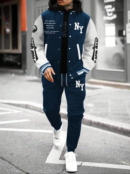 Men's Letter Print Slogan Baseball Jacket & Pants Two-piece Set, Loose Casual Long Sleeve Baseball Collar Outerwear & Trousers for Daily Wear, Men's Two-piece Outfits for Fall & Winter