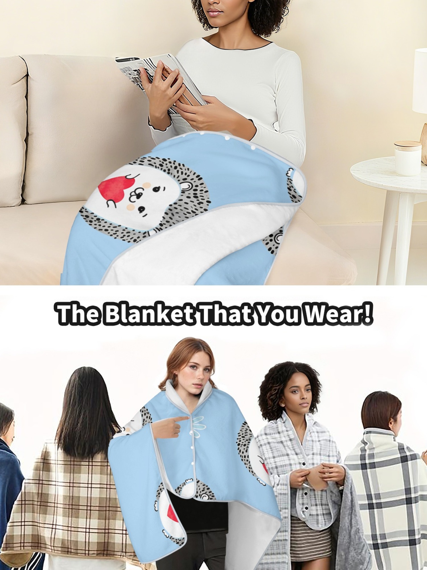 Women's Cartoon Hedgehog Printed Flannel Hooded Shawl - Warm Cozy Blanket Cape (3 Colors: Light Blue/Black/Pink)
