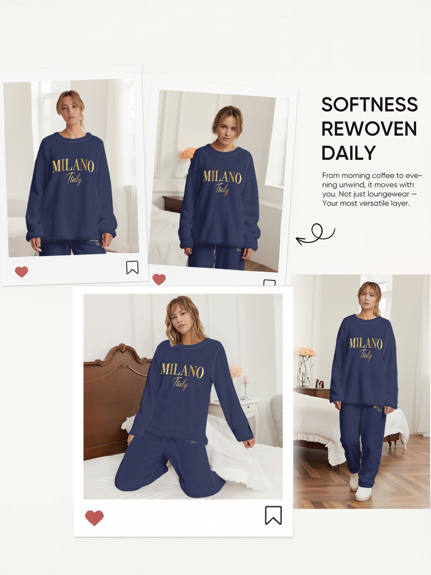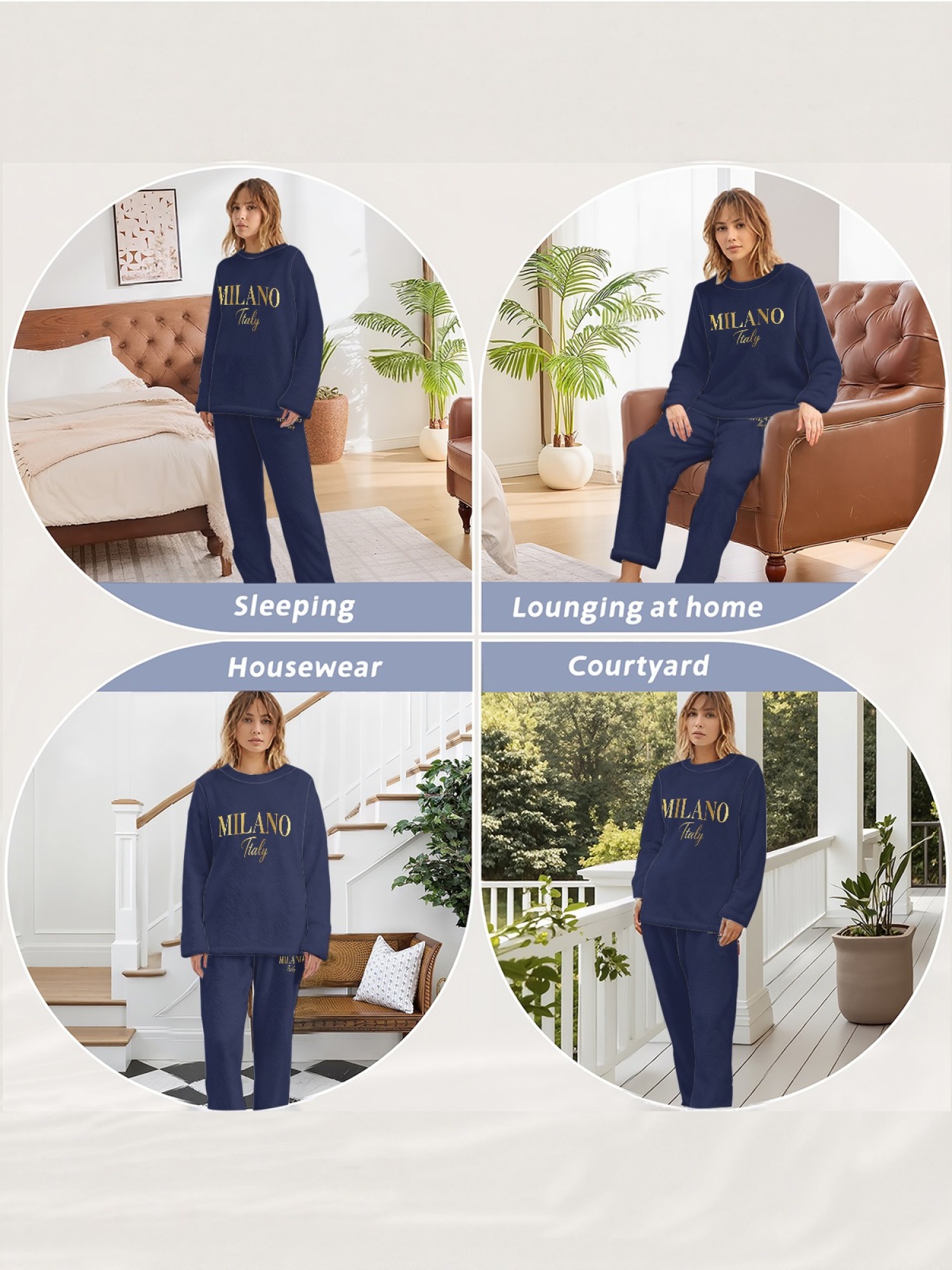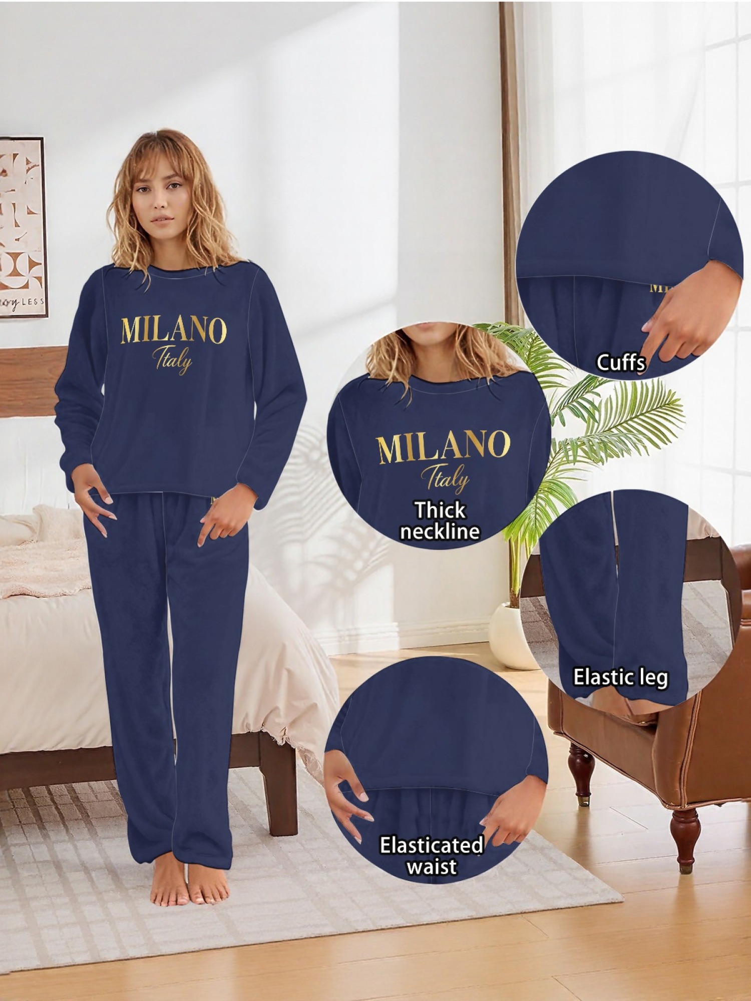 Women's "MILANO Italy" Gold Letter Printed Flannel Pajama Set - Warm Fuzzy Sleepwear (7 Colors: Navy/Graphite Black/Light Blue/Light Gray/Orange/Pink/Beige)